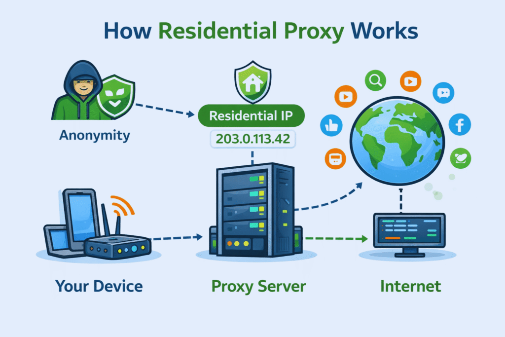 A residential proxy uses an IP address that belongs to a real household internet connection. These IPs are issued by internet service providers and are normally assigned to everyday users browsing from their homes or mobile devices.